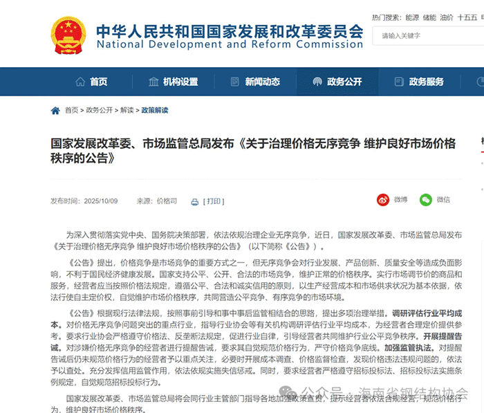 近日,国家发展改革委、市场监管总局联合发布了《关于治理价格无序竞争 维护良好市场价格秩序的公告》(2025年第4号),旨在规范市场价格行为,维护公平有序的市场环境,助力行业高质量发展。为推动我省钢结构行业健康可持续发展,我们特此发出以下倡议: